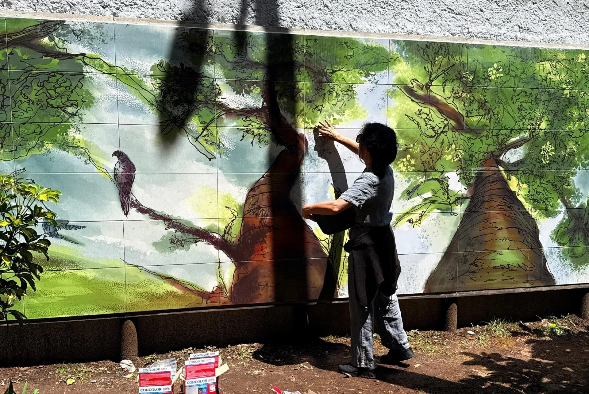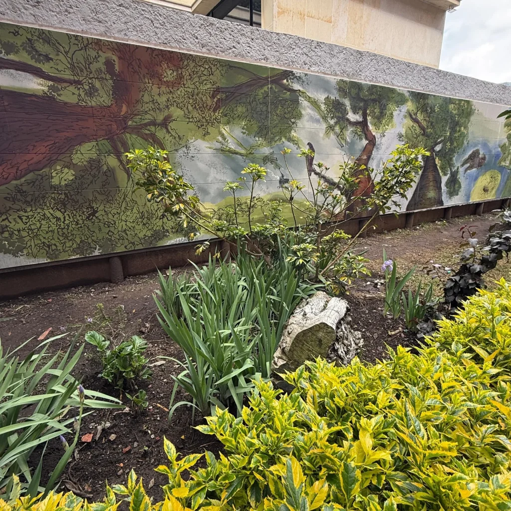 El mural no es solo una pieza decorativa; es un diálogo entre la arquitectura y la naturaleza, utilizando la cerámica como un soporte perdurable que resiste el paso del tiempo, al igual que los árboles que busca homenajear.